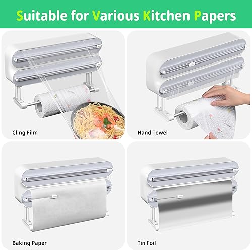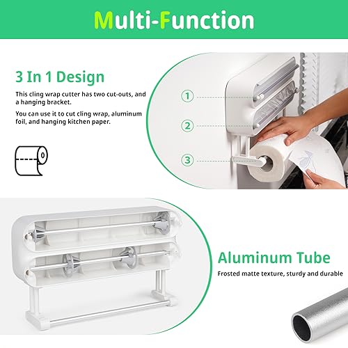 Conservazione e organizzazione: Il dispenser di pellicola trasparente è un modo semplice, salvaspazio e conveniente per conservare i rotoli di asciugamani di carta. Il design 3 in 1 contiene pellicola trasparente, foglio di alluminio e un rotolo di asciugamani di carta per un facile accesso e per risparmiare molto spazio in cucina.