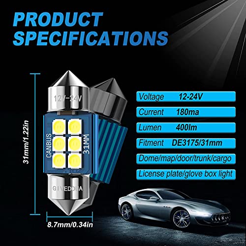【400% più luminoso】 Set di 4 lampadine a LED de3175, bianche 6000K, 400 lumen, 2,2 W per lampadina, dimensioni della lampadina: 3,1 cm x 0,8 cm, tensione di lavoro: DC 12 v-24 V. Dai al tuo veicolo luci interne a LED aggiornate per uno stile più moderno e luminoso!