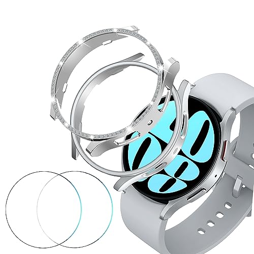 DEALELE [2+2 Pezzi] Cassa Compatibile con Samsung Galaxy Watch 6 40mm / 44mm, Bling Strass Diamante + Matte Custodia Protettiva Cover + Pellicola Protettiva in Vetro Temperato, Argento + Argento