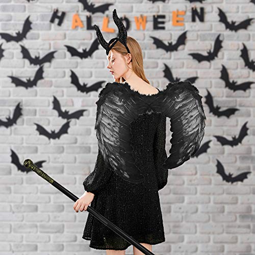 DECARETA Ali di Angelo Nero con Cinghie Elastiche, Scettro Reale, Cappello di Corna di Halloween, Halloween Costume Ali per Donne Ragazze Cosplay per Halloween, Feste in Costume e Natale