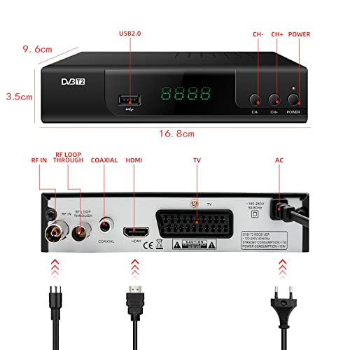 ✔【Qualità di fascia alta】 La scocca in lega di alluminio ha una buona consistenza, che rende il tuo decoder DVB-T2 di fascia alta. La fusoliera ha molti fori di raffreddamento per aiutare a dissipare il calore e proteggere il tuo decoder DVB-T2. DVB-T2 Frequency Range: VHF 174~230MHZ, UHF 470~862MHZ. DVB-C Frequency Range: 114.00MHZ-858.00 MHZ.