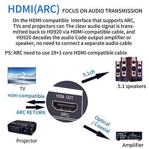 [AUDIO-DECODER] - Decodifica HDMI, Bluetooth, fibra ottica, coassiale, PC-USB, riproduzione U-disk e altro audio in un'uscita a canale indipendente 2.0 o 5.1 (6 canali) e amplifica il volume tramite un amplificatore di potenza o un attivo uscita altoparlante.