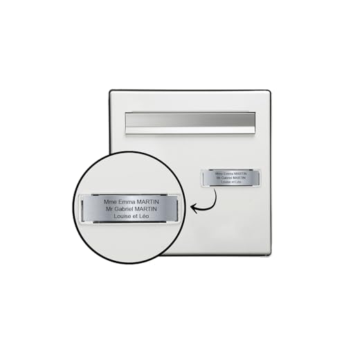 Targhetta per cassetta delle lettere personalizzata in formato 100 x 25 mm di colore argento scrittura nera. 3 righe di testo, scelta di 12 font.