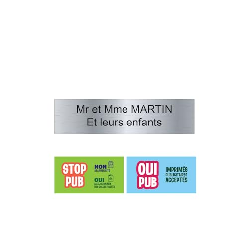 Targhetta per cassetta delle lettere personalizzata in formato 100 x 25 mm di colore argento scrittura nera. 1 riga di testo, scelta di 12 font. 2 adesivi ufficiali "Stop Pub" e "Sì Pub" in omaggio.