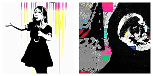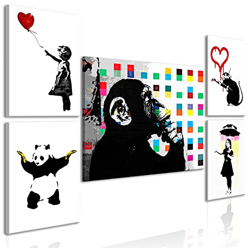 Decomonkey Quadro Stampa su Tela moderno Banksy 130x80 cm 5 pezzi Murale Fotografia Immagini Decorazione da parete Grafica Affe Street Art Panda Banana Ratto Ragazza Scimma colorato bianco
