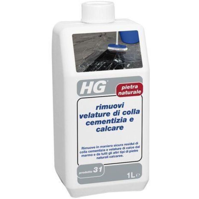 HG rimuovi velature di colla cementizia e calcare è privo di acidi e rimuove pertanto in maniera sicura velature di colla cementizia e/o calce da marmo e altri tipi di pietra naturale calcarea quali travertino, granito belga, granito e altro, ma è anche sicuro per piastrelle in calcestruzzo e sintetiche contenenti frammenti di pietra naturale quali compositi di granito e marmo. Diluire mezzo litro di prodotto in mezzo secchio (5 l) d'acqua. Bagnare preventivamente la superficie con acqua pulita, quindi applicare la soluzione con l'ausilio di un panno o un mocio. Non trattare più di 10-15 m2 per volta. Spazzolare bene la superficie con uno spazzolone o una scopa rigida, quindi lasciare agire per 5 minuti e spazzolare nuovamente bene. Rimuovere quindi la soluzione dalla superficie con uno straccio, quindi passare uno straccio sul pavimento con acqua pulita. Formato: 1LT Dimensioni Imballaggio Peso: 1,5 kg Altezza: 23 cm Larghezza: 0 cm Lunghezza: 12 cm Dimensioni articolo Peso: 1,5