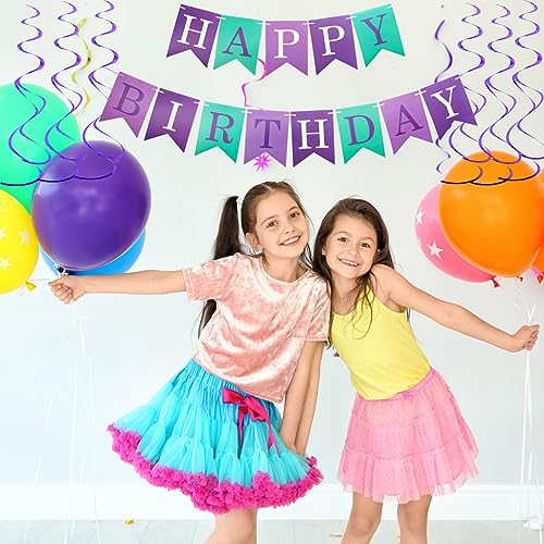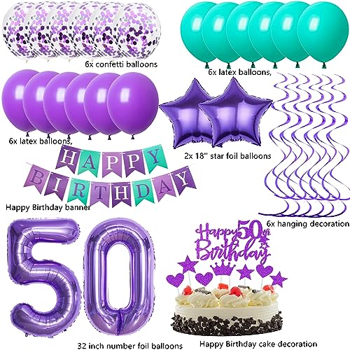 Decorazione 50 compleanno ragazza/donna viola: include palloncini in foil verdi da 32 pollici con numero "50", 1 set di ghirlanda Happy Birthday, 6x palloncini in lattice blu, 6x palloncini in lattice viola (Happy Birthday), 6x palloncini con coriandoli, 2x palloncini in foil a stella da 18'', 6x decorazioni da appendere, 1 decorazione per torta Happy 50th Birthday, 3 decorazioni per torta a cuore, 3 decorazioni per torta a stella, 1 decorazione per torta a corona, 1x nastri per palloncini.