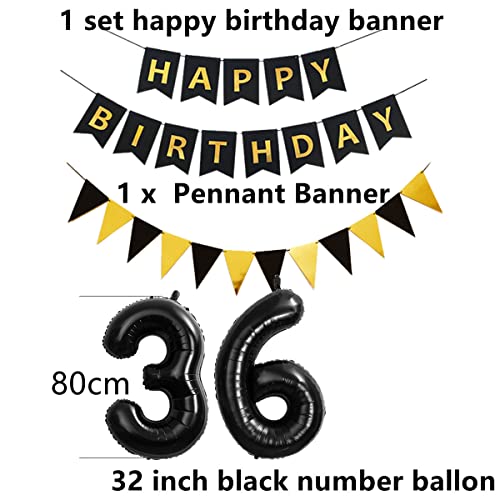 36 compleanno Decorazioni uomo donna in oro nero: Include 1 striscione nero/oro Happy Birthday, 4 palloncini neri da 12 pollici, 4 palloncini oro da 12 pollici, 4 palloncini coriandoli oro da 12 pollici, 4 palloncini coriandoli neri da 12 pollici, 2 palloncini foil numero da 32 pollici. 2 palloncini in foil oro da 18 pollici, 2 palloncini in foil nero da 18 pollici, 1 palloncino in foil oro da 18 pollici, 1 set di bandierine triangolari (12 pezzi), 1 nastro.