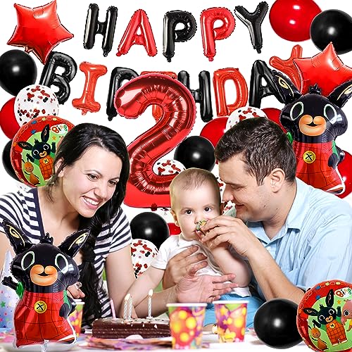 【Set di decorazioni di compleanno】 1 x striscione di buon compleanno, 1 x palloncino in alluminio numero '2', 2 x palloncini in alluminio a forma di stella, 2 x palloncini coniglio, 10 x palloncini in lattice rossi, 10 x palloncini in lattice nero, 10 x palloncini in lattice rossi con paillettes