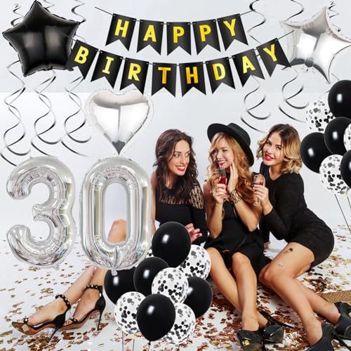 55.DECORAZIONE DI COMPLEANNO NERO ARGENTO: Include 32 pollici Digital palloncini in foil + Happy Birthday Garland + 10 palloncini in lattice + 10 palloncini coriandoli + 1 cuore palloncini in foil (18 pollici) + 2 stelle palloncini in foil (18 pollici) + Hanging Deco (6 pack) + palloncini nastri.