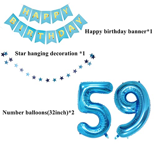 59° compleanno decorazione blu: inclusi palloncini in pellicola digitale "59" da 32 pollici + festone Happy Birthday + 10 palloncini in lattice + 4 palloncini con coriandoli + 2 palloncini a forma di cuore (18 pollici) + 2 palloncini a stella (18 pollici) + stella decorativa (4 metri) + nastri
