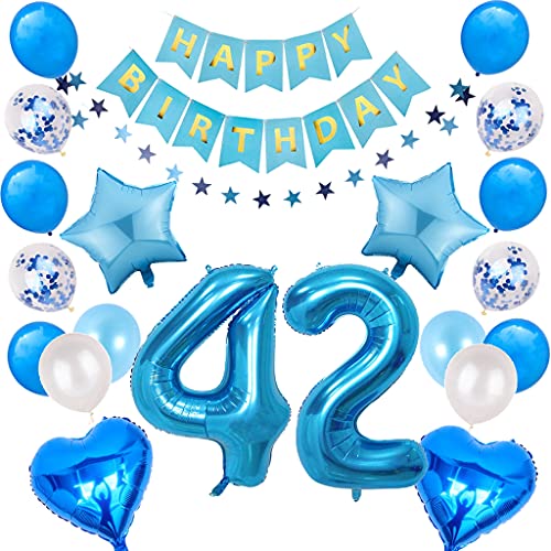 42° compleanno DEKO BLU: include palloncini digitali "42" da 32 pollici + ghirlanda Happy Birthday + 10 palloncini in lattice + 4 palloncini con coriandoli + 2 palloncini a forma di cuore (40 cm) + 2 palloncini a forma di stella (40 cm) + decorazione da appendere a forma di stella (4 metri) + nastri per palloncini