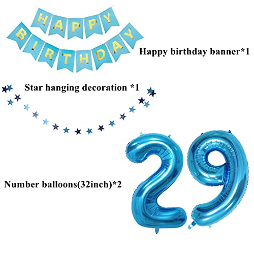 29° compleanno DEKO BLU: include palloncini in pellicola digitale "29" da 32 pollici + ghirlanda Happy Birthday + 10 palloncini in lattice + 4 palloncini con coriandoli + 2 palloncini a forma di cuore (40 cm) + 2 palloncini a forma di stella (40 cm) + decorazione da appendere a forma di stella (4 metri) + nastri per palloncini