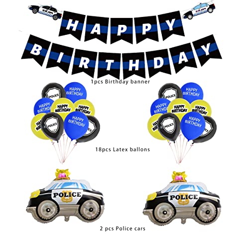 Il pacchetto include: Il set di forniture per la festa di compleanno della polizia include 1 * striscione HAPPY BIRTHDAY della polizia, 18 * palloncini in lattice della polizia (3 stili di 6 ciascuno), 2 * palloncini in foil dell'auto della polizia, ogni accessorio ha elementi di polizia, queste decorazioni per la festa di compleanno della polizia aggiungeranno divertimento alla tua festa.