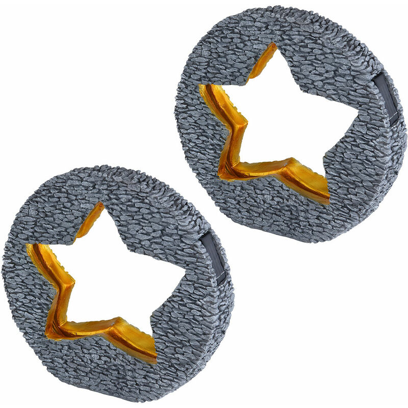 Descrizione La lampada solare rotonda effetto pietra (classe di protezione IP44) è un'aggiunta suggestiva al vostro patio o giardino. L'interno della lampada solare da 29 cm ha un ritaglio a forma di stella ed è color oro. Insieme alla luce bianca calda (3000 Kelvin) dei 48 punti luce sulla striscia LED a energia solare, questo crea un'atmosfera piacevole nella tua area esterna. Le lampadine a LED sono installate in modo permanente nella lampada. La fornitura comprende due lampade solari! Particolare lampada • Tipo di lampada: lampada solare • Materiale: plastica • Colore: grigio, oro • Grado di protezione: IP44 • Interruttore • Autonomia: 6-8 ore • Batteria inclusa: 1xAA 600mAh Ni-Mh 3V • Lunghezza x larghezza x altezza in cm: 31x8,5x29,5 • Illuminante: 1x LED • Lampadine incluse: Sì (installate in modo permanente) • Potenza della lampada: 1x 0,06 watt • Temperatura colore: 3000K (Kelvin) • Colore della luce: bianco caldo • Tensione: 3 V (volt)