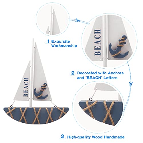 Bella barca a vela: la barca a vela in legno è molto bella, con design unici e colori ben assortiti. Lo scafo della barca di legno è blu e la corda di spago è avvolta attorno allo scafo. L'albero è bianco. Due vele, una grande vela bianca con un'ancora e una piccola vela bianca con le lettere "BEACH".