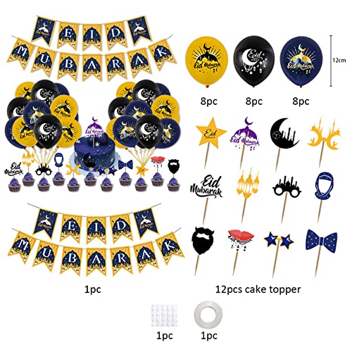 Decorazione con Palloncino Eid Mubarak  1 pz bandiera da tirare, 8 pz palloncini in lattice nero, 8 pezzi palloncini in lattice dorato e 8 pezzi palloncini in lattice blu luminosi tutti i 12 pollici. Un Set di cake topperr 12 Pz. 1 rotolo di nastro, 1 pezzo di colla.