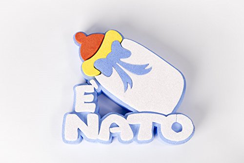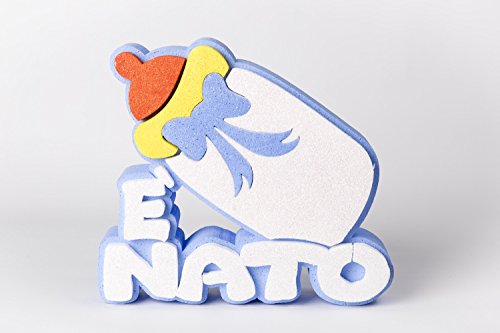 Decorazione nascita " e' nato" glitterata in polistirolo celeste con biberon ci114