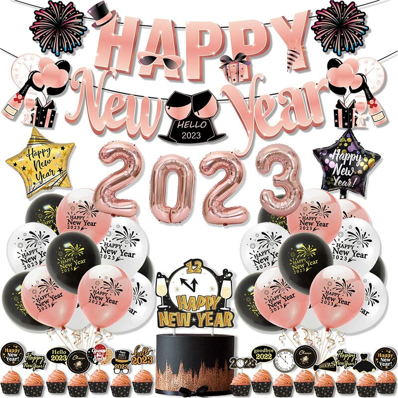 Contenuto della confezione - include 1 striscione con lettere "HAPPY NEW YEAR", 4 palloncini foil giganti, 2 palloncini a stella, 6 palloncini neri, 6 palloncini bianchi, 6 palloncini oro rosa, 1 cake topper HAPPY NEW YEAR, 15 torte piccole decorazioni. 【Materiale】Il banner è realizzato in cartone rigido e può essere utilizzato per molte volte. I palloncini sono realizzati solo in lattice naturale, atossico e biodegradabile al 100%. I palloncini di alluminio possono essere sgonfiati e poi rigonfiati l'anno successivo. I cake topper sono realizzati con cartoncino di alta qualità e gli stuzzicadenti sono resistenti, non fragili, sicuri e non tossici, riutilizzabili e durevoli. 【Facile da usare】 Lo striscione del felice anno nuovo è preassemblato. Prenditi un po' di tempo per indossare la decorazione sospesa e gonfiare i palloncini per decorare la tua casa e creare un'atmosfera di festa allegra. 【Forniture per feste】 La nuova decorazione per feste 2023 ti consente di celebrare momenti