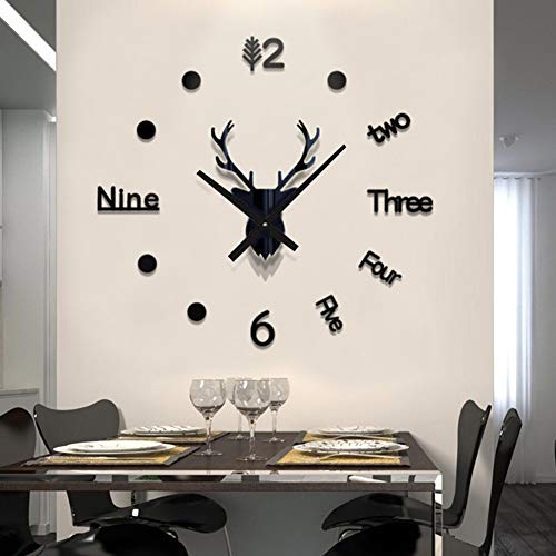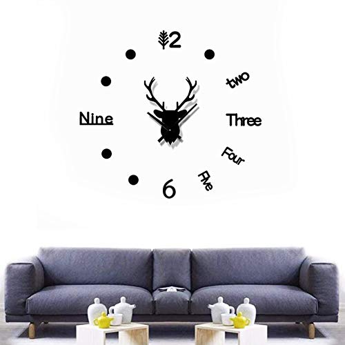 CYSJ Decorazione da parete moderna orologio con specchio DIY Orologio da Parete Testa di cervo 3D Specchio Adesivi per Casa, Ufficio,Scuola Decorazione (nero)
