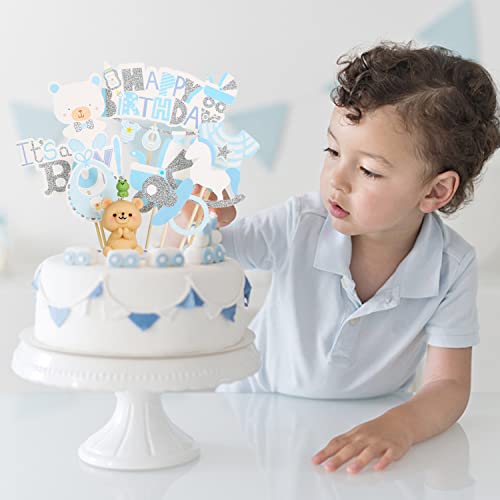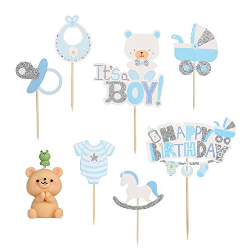 Set di topper per torte: 1 orso, 1 bandiera triangolare per torte, 7 topper per torte blu