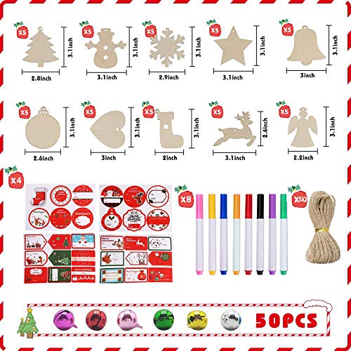 Decorazioni Albero Di Natale Legno, 50 Pezzi Addobbi Albero Di Natale con 8 Pennarelli, 50 Campane Tintinnanti, 4 Adesivi Natalizi, Ideali per l'Albero Natale Appesi Decor Art Crafts Regalo DIY