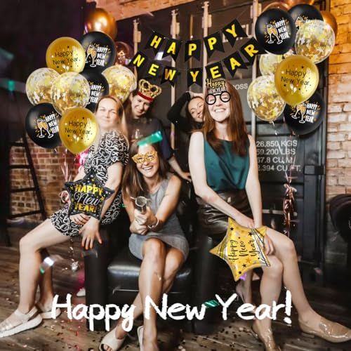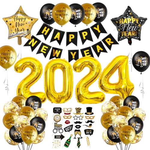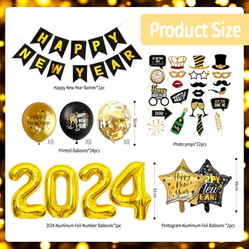 【Decoration Nouvel An 2024】1* banner di buon anno " Happy New Year", 4* Palloncini in Alluminio Giganti "2024", 15* pezzi di accessori foto divertenti/Foto booth props,2* Palloncino pentagramma in alluminio, 24* palloncini in lattice(Oro* 8, Nero* 8, Oro Coriandoli * 8).
