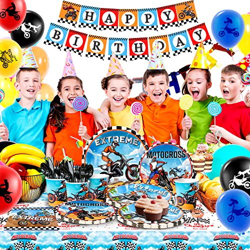 Decorazioni Moto Compleanno, 98pcs Set di Decorazioni Compleanno Tema Moto Bambini Includ Piatti e Bicchieri Motocross Tovaglioli Tovaglia Palloncini Striscione etc Accessori di Compleanno Per Moto