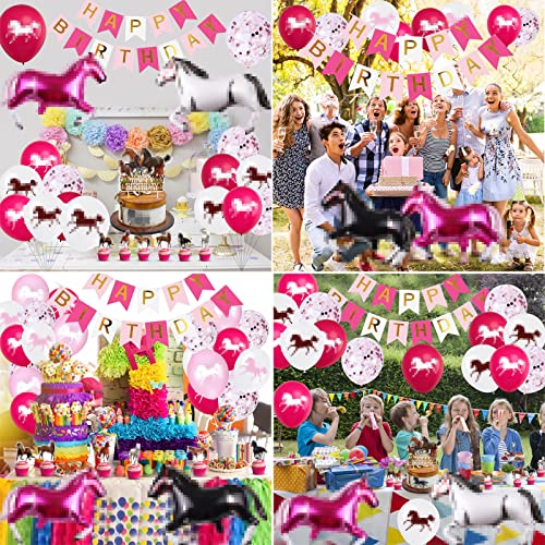 Set di decorazioni per cavalli per il compleanno dei bambini: 1 striscione Happy Birthday, 24 topper per cupcake, 1 grande topper per torte, 16 palloncini in lattice per cavalli in 3 colori e 2 palloncini in alluminio per cavalli in diversi colori;