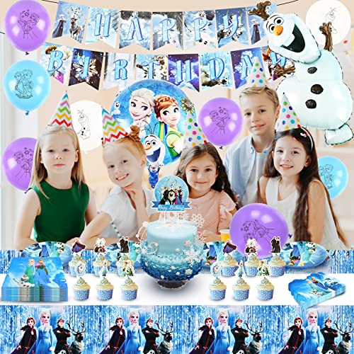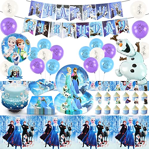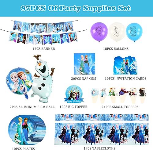 Decorazioni di Compleanno Congelate, Palloncini Frozen, Set di Stoviglie per Feste da 87 Pezzi con Palloncini in Foil, Striscione Frozen, Piatti, Tovaglioli, Tovaglia, Cake Topper, Biglietti d'invito