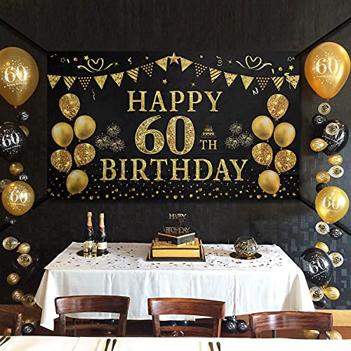 60 Decorazioni Compleanno Oro Nero, GuKKK Birthday Party Background, Cheers To Years Bandiera, Happy Birthday Banner, 60 Anni Poster di Tessuto Sfondo Fotografico Con 15 Pcs Palloncino in Lattice
