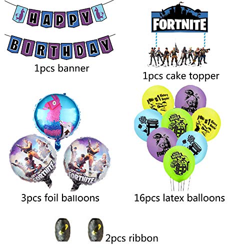 L'imballaggio include 16 palloncini in lattice, 3 palloncini in alluminio, 1 striscione di buon compleanno, 1 topper grande per torta e 2 nastri.