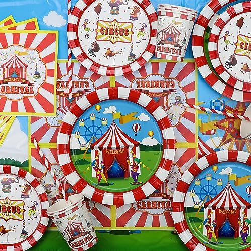 Decorazioni per feste di carnevale del circo per feste di compleanno per bambini, Include bandiera, striscione di compleanno, tovaglia, palloncini, piatti di carta, tovaglioli, bicchieri, per 20