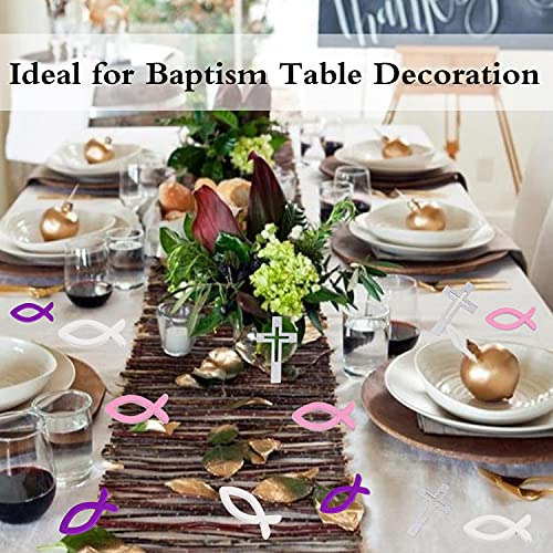Decorazioni a Forma di Pesce in Legno, 120Pcs Comunione Decorazioni, Pesce Battesimo Legno Decorazione per Cresima Comunione Croce D'argento, per battesimo, comunione e cresima (Rosa)