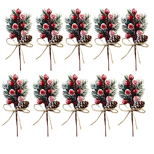 10 Decorazioni Natalizie a Bacca Rossa, Rami Artificiali con Steli di Agrifoglio, Pigne e Bacche Rosse, Utilizzate per Alberi di Natale, Ghirlande, Biglietti di Auguri, Regali e Altre Decorazioni
