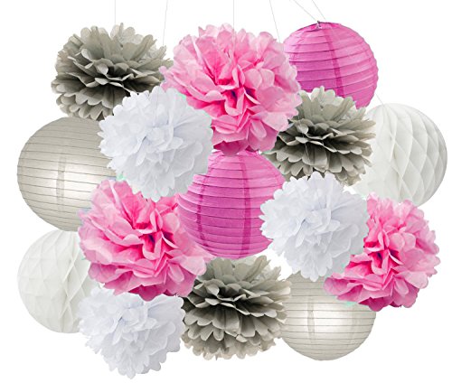 Decorazioni Baby Shower Furuix 15pcs Fuchsia Grigio Bianco Decorazioni per feste Carta velina Pom Pom Honeycomb Ball per addio al nubilato Decorazioni per feste di compleanno
