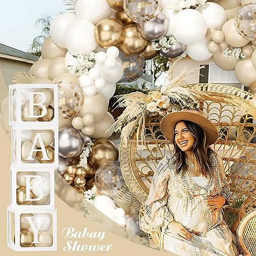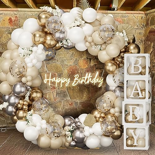 ✨【CONFEZIONE CONVENIENZA DA 183 PEZZI】- 4 scatole per palloncini da 10,6'' x 10,6'' x 10,6'' con 27 lettere (A~Z+B). Kit arco per palloncini in oro bianco da 152 pezzi che include 40 palloncini bianchi, 40 palloncini bianchi sabbia, 30 palloncini oro metallizzato, 30 palloncini oro rosa, 10 palloncini coriandoli, catena per palloncini 1X5M e 1 pezzo di colla 100. Kit completo di decorazione BABY SHOWER, forniture per feste di COMPLEANNO.