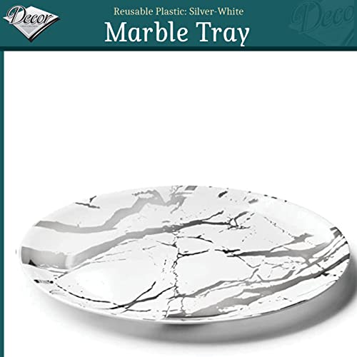 Decorline - Vassoio da Portata - Set di 4 - Robusti Piatti da Portata in Plastica Riutilizzabili un aspetto Marmor, Vassoio Decorativo e Elegante, buffet delle feste - Tondo Ø 35 cm - Bianco/Argento