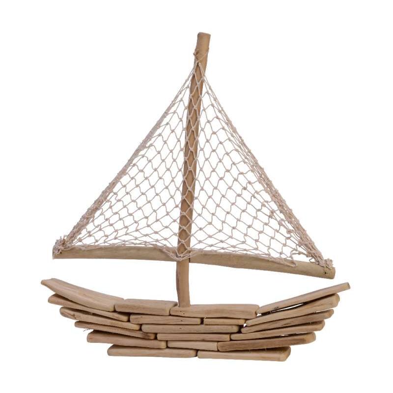 Decorazione da appoggio a forma di barca realizzata in legno con vela di rete. Colore naturale. Misura 5 x 44 x 45 cm.. Acquistalo subito da CFadda e ricevilo comodamente a casa.