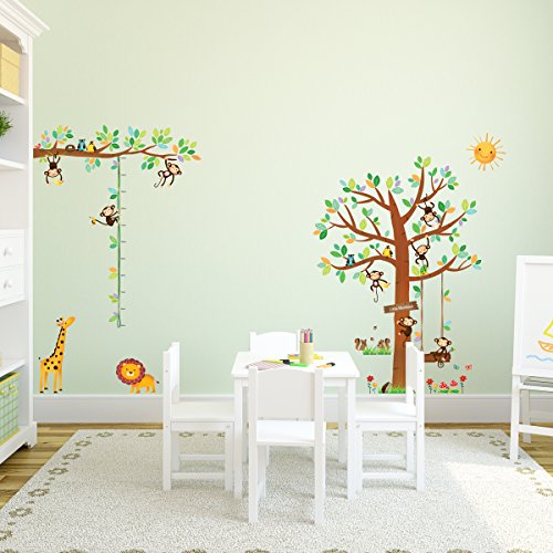 DECOWALL DA-1401P1402 Albero con 8 Scimmiette e Tabella di Altezza Adesivi da Parete Decorazioni Stickers Murali Soggiorno Asilo Nido Camera Letto per Bambini decalcomanie