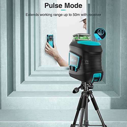 【Luminosità regolabile Modalità luce verde e impulso】 DJ03CG può regolare le tre modalità di luminosità del laser tramite il tasto M. Nella modalità più luminosa, la luminosità della linea laser aumenta e lampeggia velocemente, il che è più adatto per l'uso in ambienti luminosi. il raggio di lavoro del laser con luminosità normale può raggiungere i 30 m e la precisione è di ± 2 mm/10 m Premere il pulsante della modalità impulso per attivare la modalità impulso esterno.