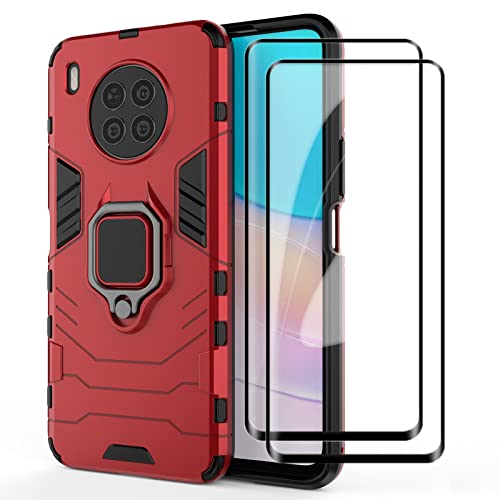 Dedux Custodia Cover + [2 Pezzi] Pellicola Protettiva per Huawei Nova 8i / Honor 50 Lite, Supporto per Anello in Metallo [Supporto Magnetico per Auto] Vetro Temperato. Rosso