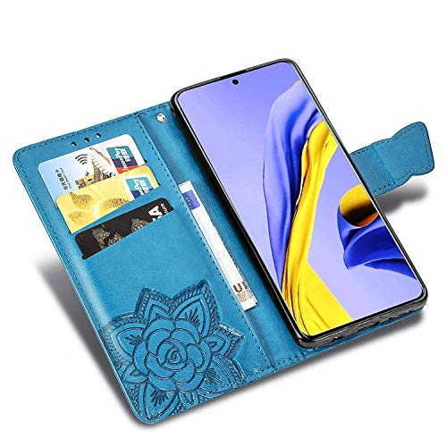 Dedux Portafoglio Custodia per Samsung Galaxy A71, Cover per Custodia a Farfalla con Fiore di Rosa in Rilievo [Funzione Stand] [Slot Cart] [Chiusura Magnetica], Dotata di Cordino. Blu