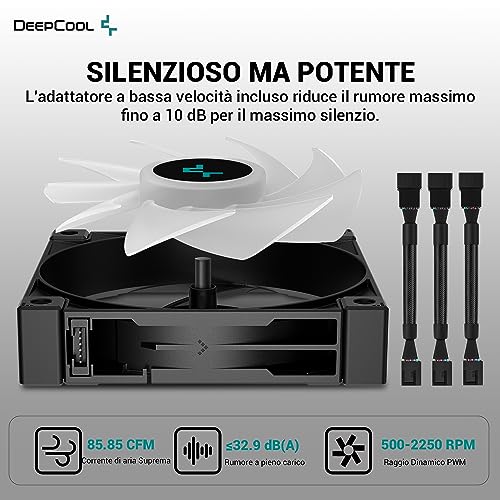 Le ventole DeepCool FE120 5v-3pin ARGB, ciascuna fino a 2250RPM, offrono un flusso d'aria di 85,85CFM e supportano il potente sistema di raffreddamento ad aria con un livello di rumorosità inferiore a 32,9dB(A) a pieno carico;