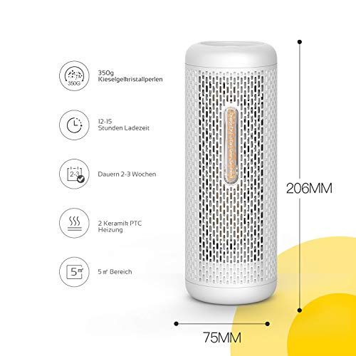 Cristalli di gel di silice rinnovabili: le perle di cristallo in gel di silice sono atossiche, sicure e senza fuoriuscite e assorbono efficacemente l'umidità dall'aria. 350 g di granulato possono assorbire umidità per 2-3 settimane a seconda dell'umidità.