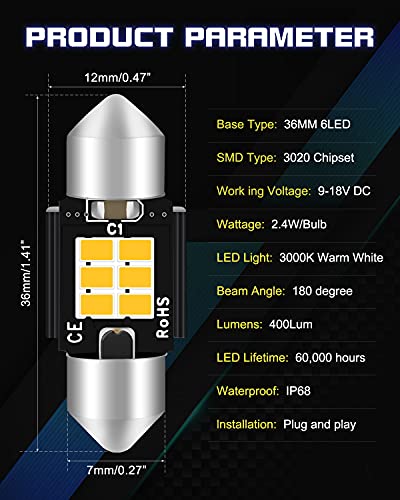 DEFVNSY 6PCS Xenon 36MM 1,41 "Bianco Caldo Estremamente luminoso 400Lums Canbus Senza errori 3020 6SMD Lampadine LED a festone per DE3423 6418 C5W 4410 Luci interne per auto 3000k