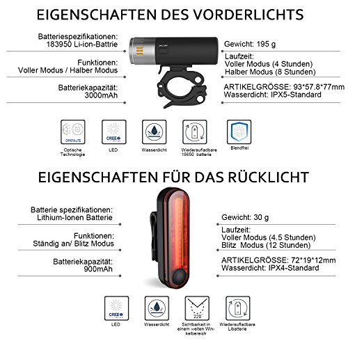 【StVZO tedesco approvato】 - Il nostro set di biciclette ricaricabile è dotato solo della modalità costante a pieno regime costante e della metà costante, progettata rigorosamente secondo lo standard di trasporto tedesco ed è certificata da CE e ROHS. Chiusura lampo ricaricabile libera che viene con l'acquisto. Aumenta la tua visibilità, ora con 360 gradi di protezione.