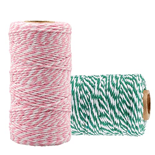 DEIOKL 2 Rotoli Spago di Cotone Natalizio, 100 m/Rotoli Natale Corde di Cotone per Artigianato Fai da Te, Floristica, Confezioni Regalo, Etichette, Cottura, Giardinaggio, (Rosa+Verde Scuro)