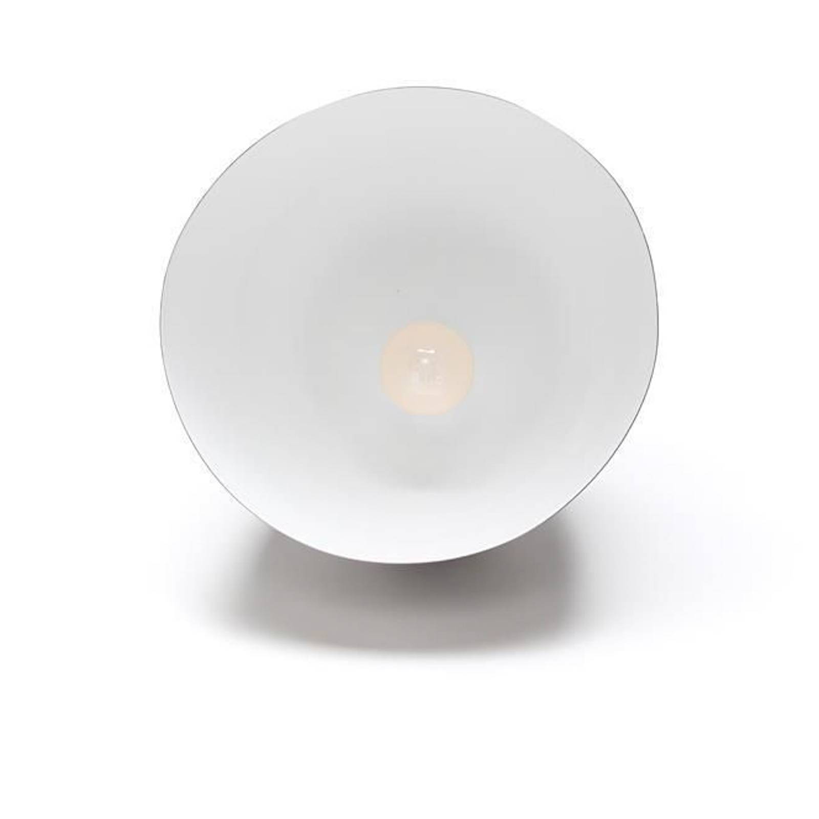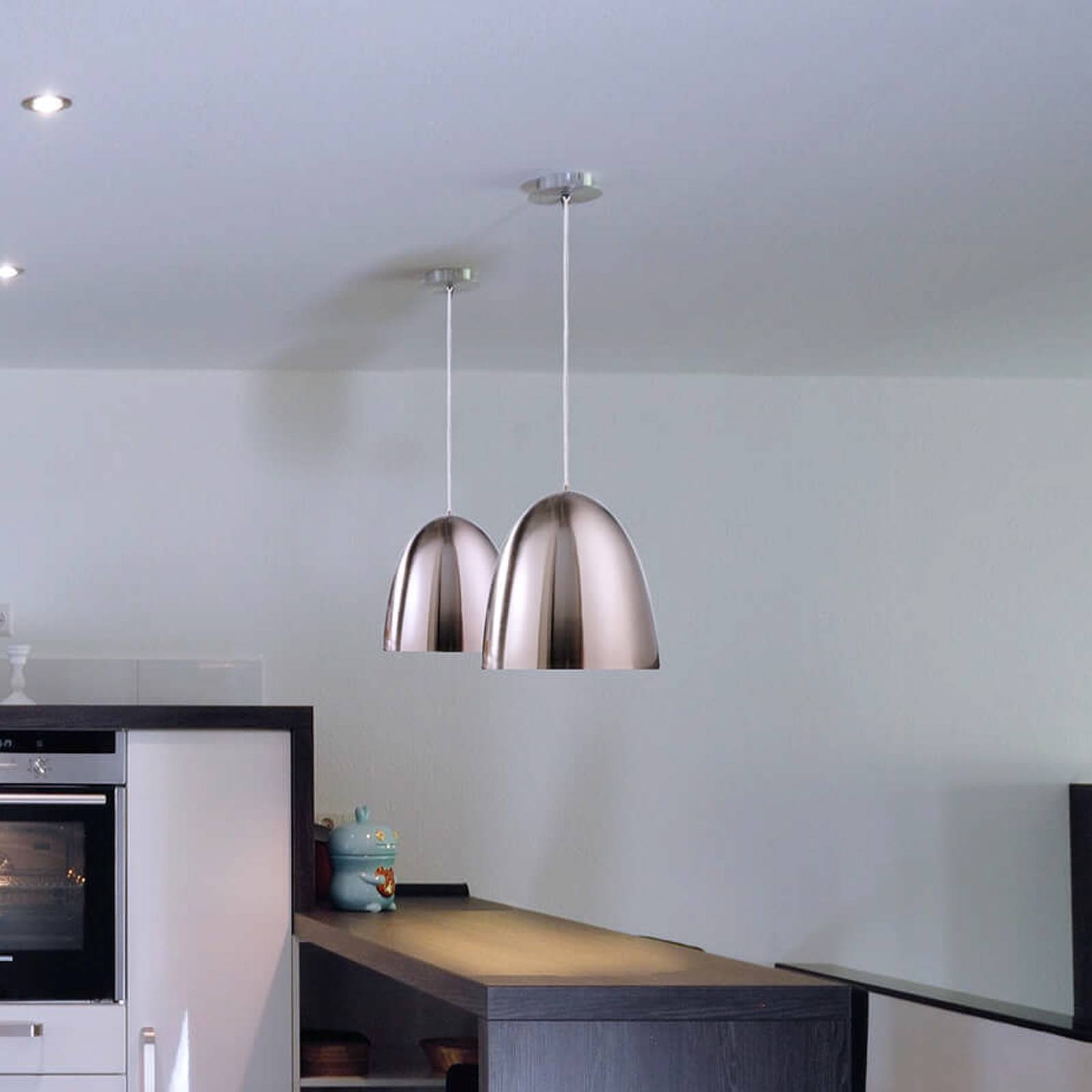 Lampada a sospensione a campana dal design elegante La lampada a sospensione monolampada è dotata di un paralume in metallo. Ha la forma di un ovale dimezzato e sembra particolarmente elegante con la finitura monocromatica. L'interno laccato bianco assicura un'efficiente emissione di luce. Il baldacchino rotondo è disegnato nel colore esterno dell'ombra. Bell fornisce una luce diretta ai tavoli, ai banconi o in generale alla parte della stanza direttamente sotto, evitando qualsiasi abbagliamento ai lati.