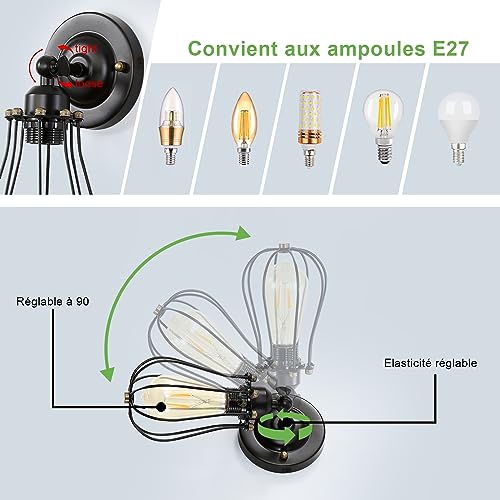 【Applique da parete interno regolabile】Le lampada da parete interno vintage sono girevoli, la lunghezza e la larghezza sono 28 cm x 15 x 12 cm. La direzione della applique da parete interno nero può essere regolata.